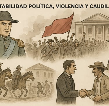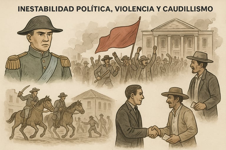 En medio del desorden surgieron líderes carismáticos que reunían seguidores leales: los caudillos. Prometían orden y progreso, pero su fuerza se sostenía en redes de clientelismo (favores a cambio de apoyo). Hacían y deshacían alianzas con las élites, y aunque podían pacificar por un rato, rara vez construían instituciones duraderas.