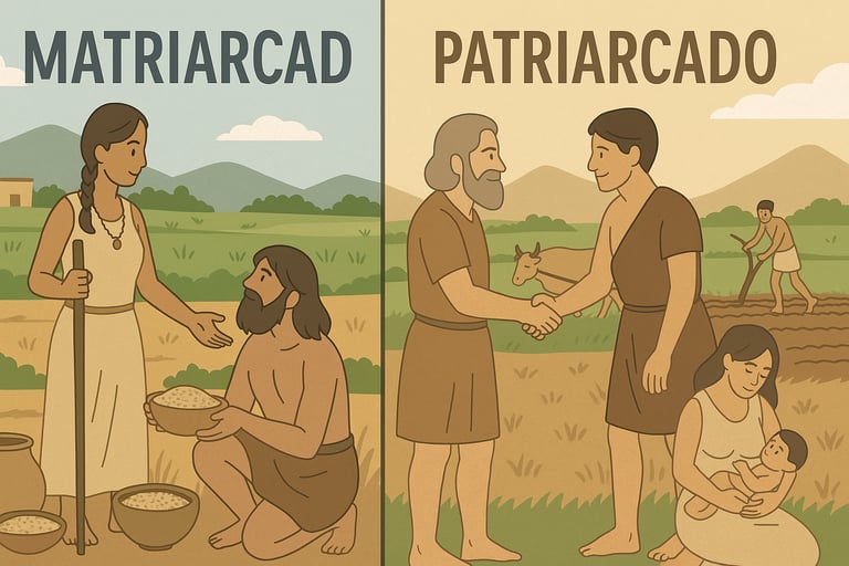 Durante mucho tiempo, las mujeres tuvieron un papel central en las comunidades primitivas: cuidaban, cultivaban y transmitían el conocimiento. Pero con la llegada de la agricultura sedentaria, todo cambió. Las personas dejaron de moverse de un lugar a otro, comenzaron a acumular bienes y tierras, y poco a poco surgió una nueva forma de organización social: el patriarcado, donde los hombres tomaron el control de la producción y del poder político.
